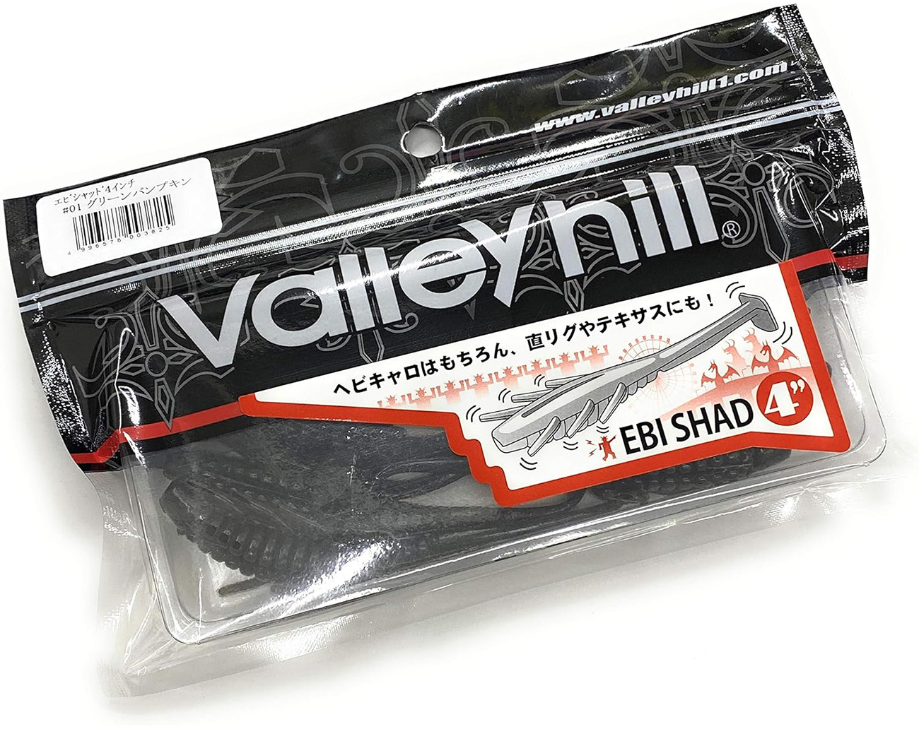 Valleyhill EBI SHAD är ett nytt coolt bete från Japan. Unikt format mjukt bete med ben och shad-stjärt, som imiterar hälften räkor och hälften fiskar. Istället för att sträva efter stora rörelser, strävade Valleyhill efter "fina", "mjuka", "responsiva" rörelser för detta mjukbete, som tilltalar mer läskiga fiskar. Det utvecklades ursprungligen för långkastande Carolina Rig, men det fungerar även för olika riggar som Light Texas Rig, Jig Head, Drop Shot och Split Shot Rig.