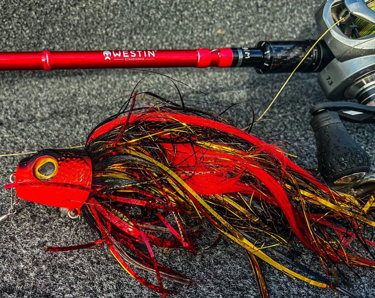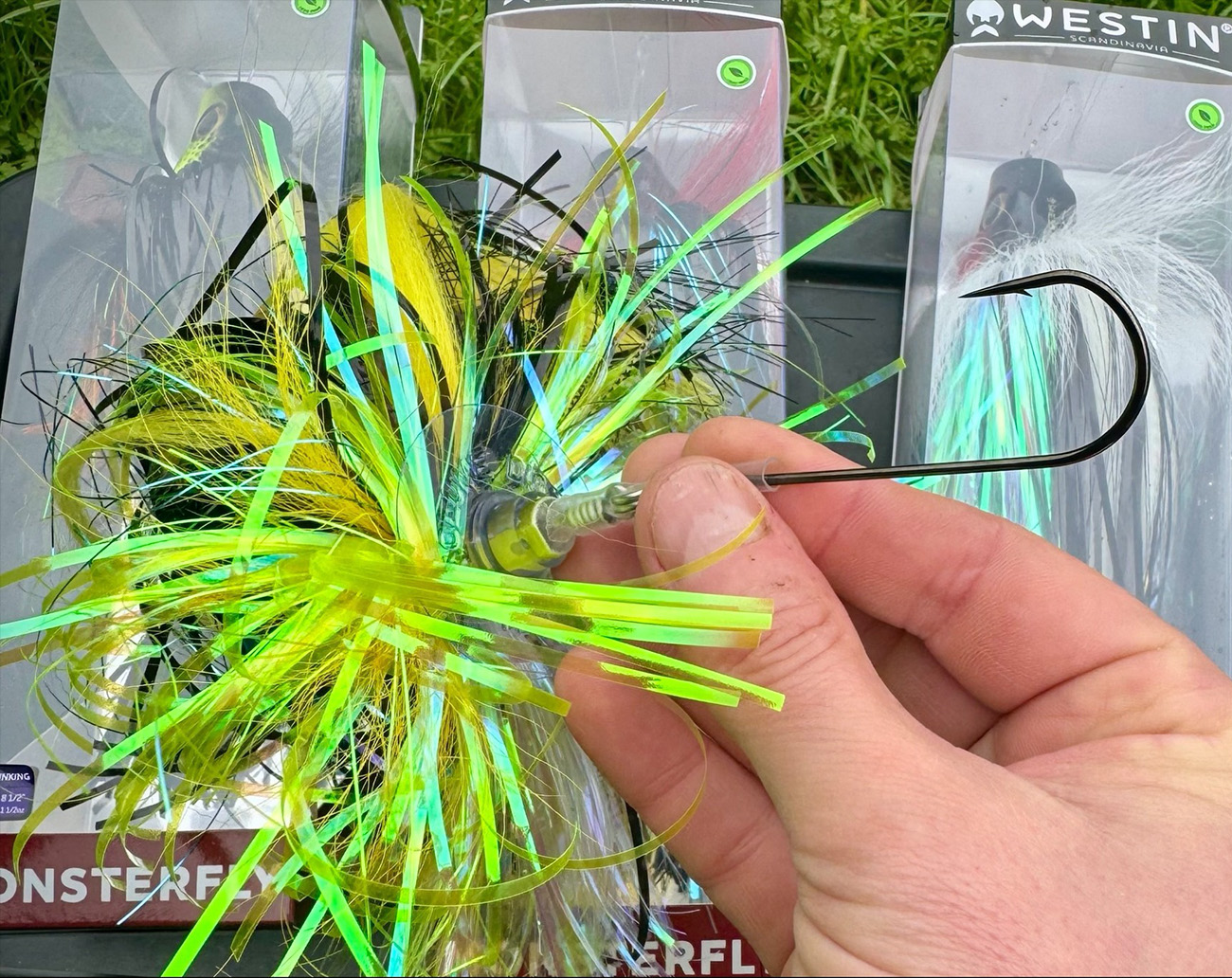 Modern pike fly with hard‑pushing ABS head and mixed fibres for flash and volume. Fish it shallow, deep, slow or fast with ease. Westin Monsterfly is built for days when predators ignore ordinary lures. The oversized ABS head with golf ball pattern pushes water, creates turbulence and throws off bubbles that help fish track it even in coloured water or low light. The mix of deer hair, tinsel, rubber skirt and synthetic fibres keeps the profile large, adds flash and reduces hook tangles, cast after cast.Fish it straight from the package, but watch the hidden single hook. Work it slowly over shallow weedbeds, or attach a switch weight to the extra eye for deeper and faster presentations. With a heavier sinker you can even jig it down steep edges. Thanks to the split ring you can remove the special carbon steel single hook and mount any shallow-rigged soft lure instead, turning Monsterfly into a versatile hybrid head.