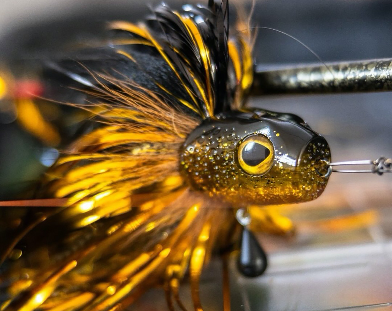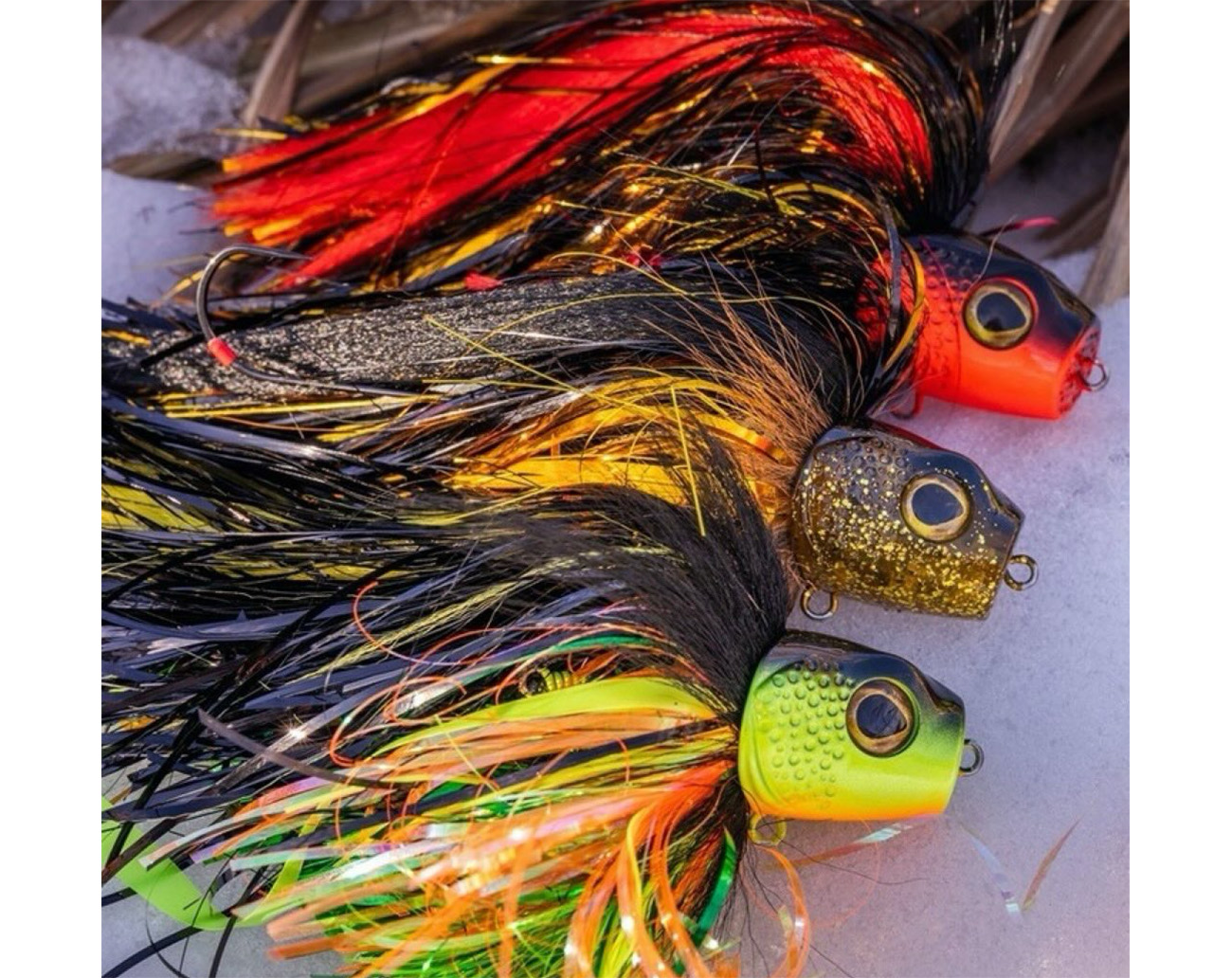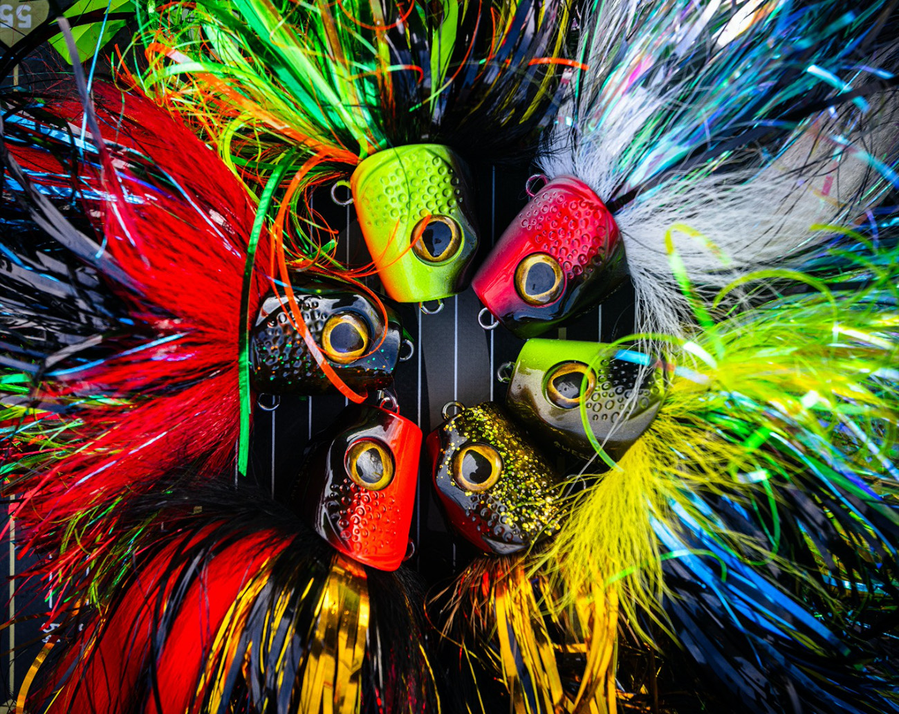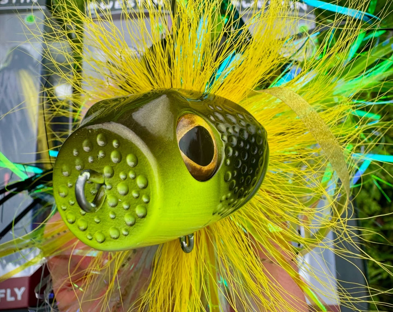 - Deer hair, flash tinsel, rubber skirt and synthetic fibres