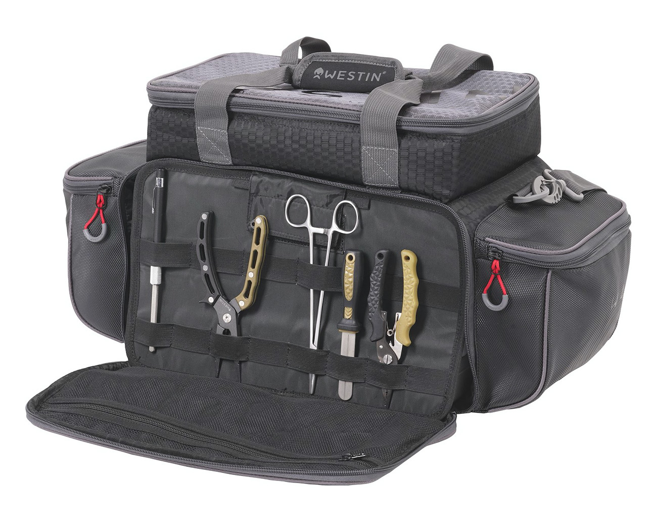 The W4 P&T Master Bag is the perfect solution for keeping all your gear organized. The main compartment includes five Westin Tackle Boxes, with the top compartment storing trout dough jars and lures in an EVA foam holder. Keep tools close at hand in the front tool organizer plate. Side pockets keep all your accessories at hand whenever you need them. With water-resistant materials, carry handle and a removable padded shoulder strap, the W4 P&T Master Bag keeps all your gear protected.