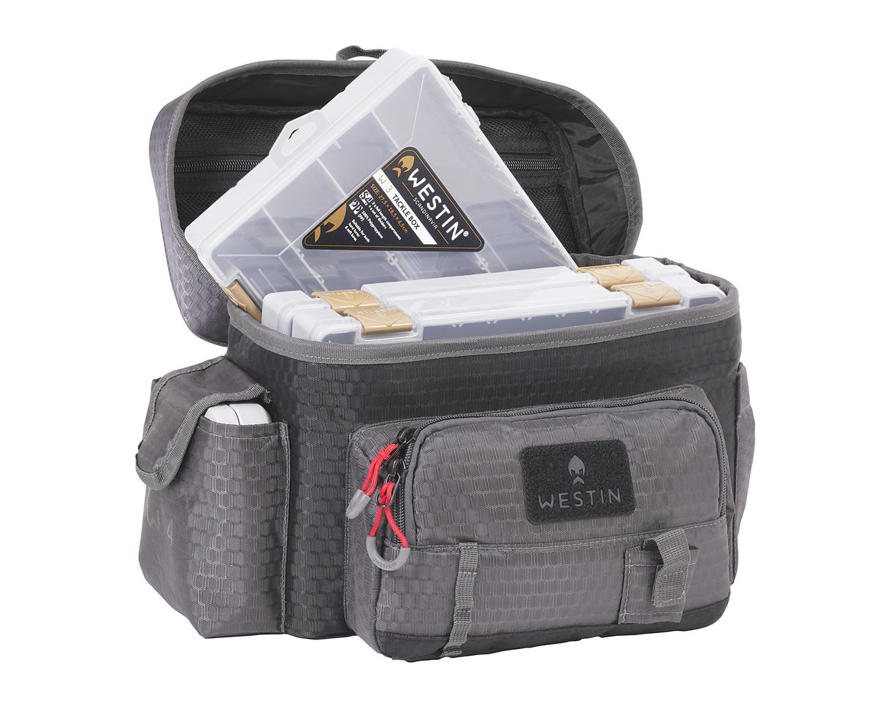 - 1 Westin Terminal Tackle Box B07-M-022 (13.2 x 9.7 x 4.4 cm) + 3 Westin Tackle Box B02-706-027 (27,5 x 18,5 x 4,5 cm) included