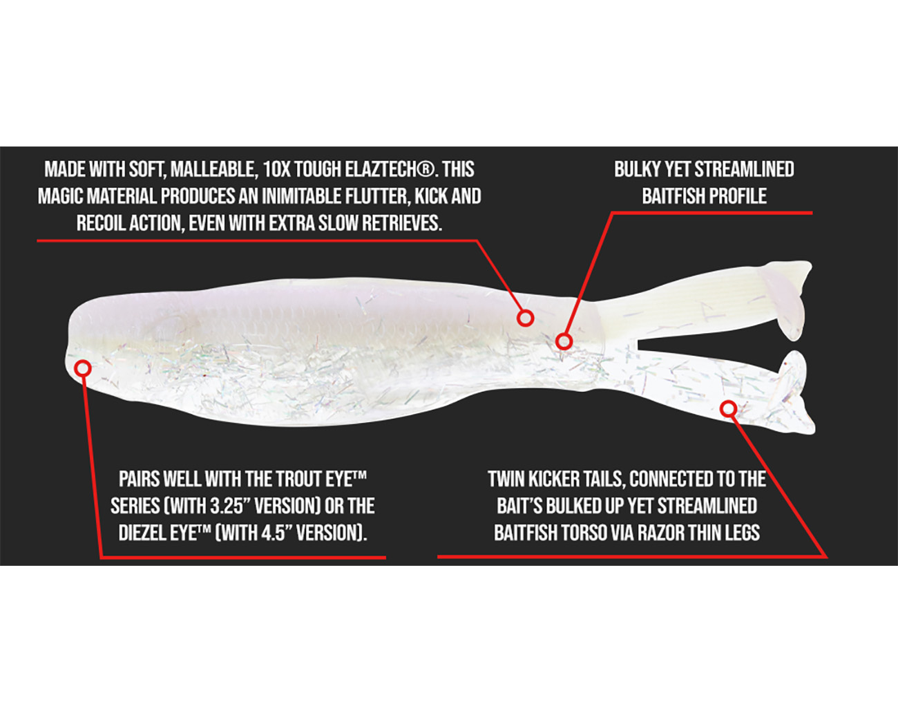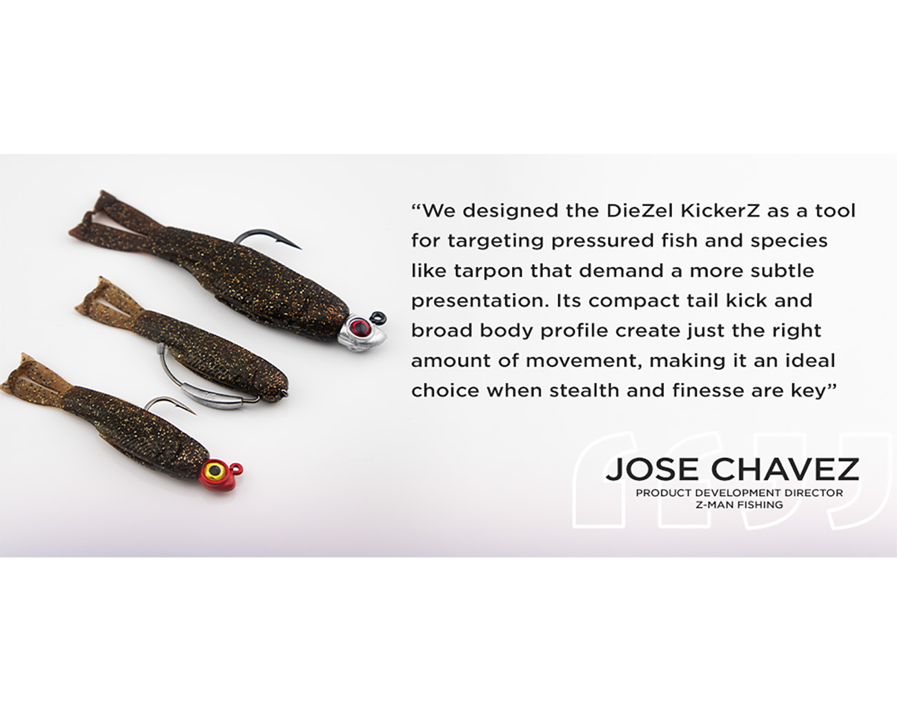 Scissor kicking its way to epic inshore bites, the 3.25- and 4.5-inch Z-Man® DieZel KickerZ is a stealthy reimagining of the classic DieZel MinnowZ™ swimbait. The DieZel KickerZ’ magic resides in its twin kicker tails, connected to the bait’s bulked-up yet streamlined baitfish torso via razor thin legs—only possible with soft, malleable, 10X Tough ElaZtech®. This magic material produces an inimitable flutter, kick and recoil action, even with extra slow retrieves. An exceptional bait for wary tarpon to selective snook and redfish, the DieZel KickerZ offers a refined, subtle kicking action and the right silhouette to close the deal. Made to match superior Z-Man saltwater jigheads, including the Trout Eye™ Series (with 3.25” version) or the DieZel Eye™ (with 4.5” version). Each sale of Z-Man DieZel KickerZ helps support Captains for Clean.