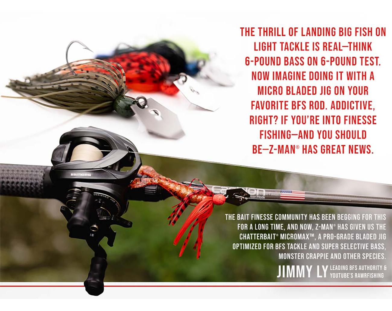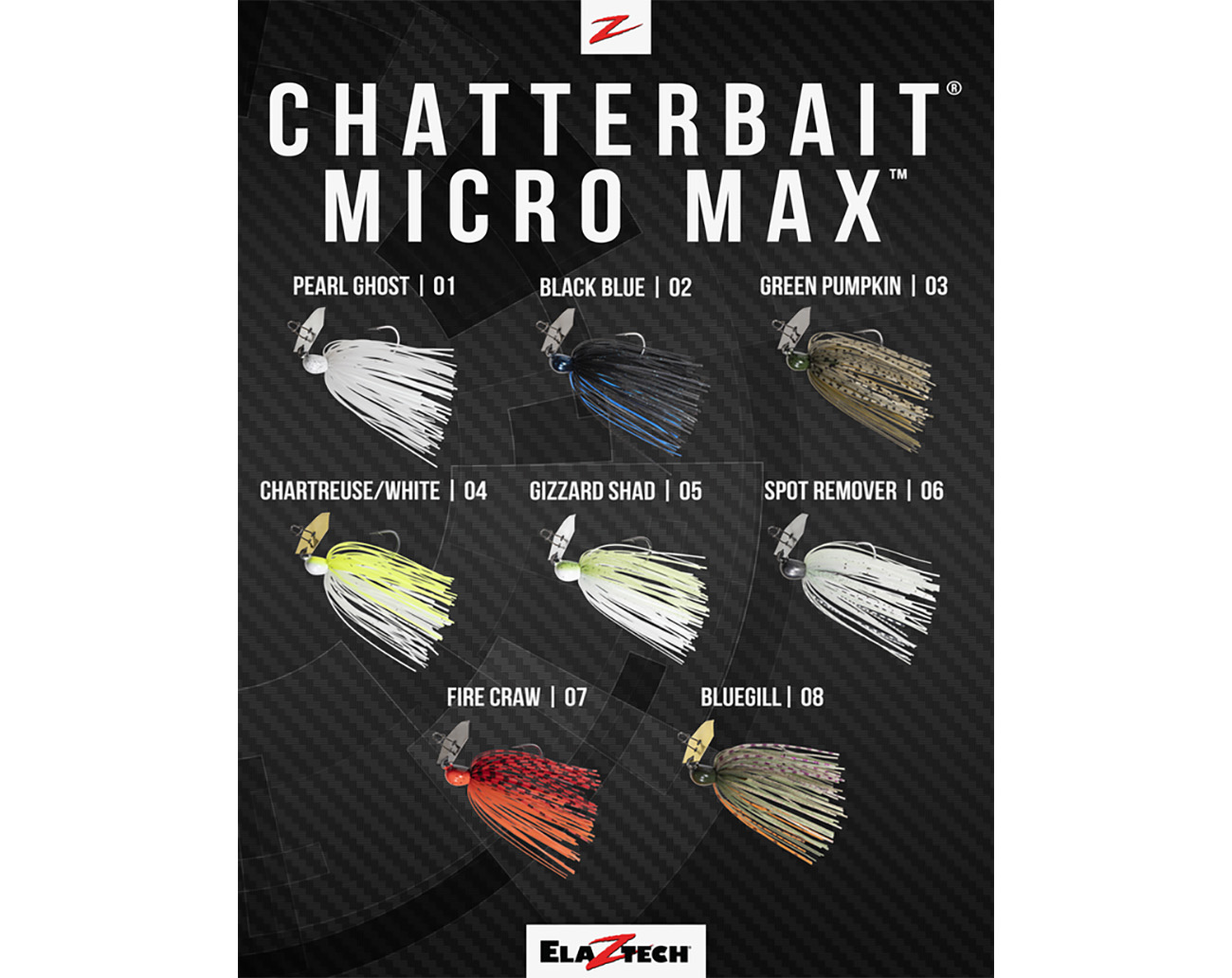 För att möta sportfiskares efterfrågan på en nedskalad, tävlingsklassad bladed jig har Z-Man utvecklat ChatterBait® MicroMax™ – perfekt för Bait Finesse System (BFS) och andra finessupplägg. Byggd med samma direkta blad-till-huvud-konstruktion och det patenterade, sexkantiga ChatterBlade® i rostfritt stål som driver alla Z-Mans chatterbaits, levererar MicroMax kraftfulla vibrationer och oregelbunden gång i ett mindre format.