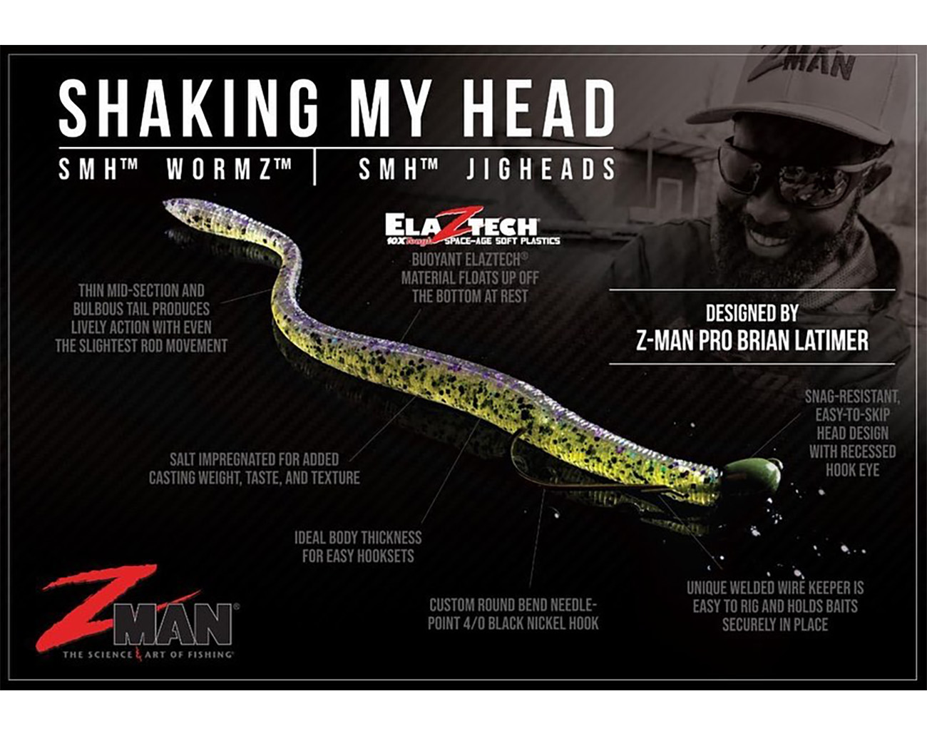 Designad av Z-Man-proffset Brian ‘B.Lat’ Latimer, denna shaky-style jigghuvud har en specialdesignad nålspetsad 4/0-krok, en svetsad wirebait-hållare, en strömlinjeformad huvuddesign och en försänkt krokögla. Den är perfekt anpassad till SMH™ WormZ™ för att skapa en oslagbar finesse-kombination. Utvecklad för att matcha SMH™ WormZ™ och framhäva dess svansrörelser, är SMH™ Jighead byggd enligt Brian 'B.Lat' Latimer's exakta specifikationer – från exakta vinklar och huvudform till den perfekta kroken. För att enkelt glida genom gräs och buskar, röra sig smidigt på bottenoch ta sig över stenar och andra hinder, har jigghuvudet en spetsig nos och en vinklad linögla. Krokögat är något försänkt för att ytterligare minska risken för att fastna. Den släta, ovala jiggytan gör att den enkelt kan kastas och studsa in under båtbryggor, trädlämningar och andra överhäng. För diskreta och effektiva krokningar med 6-15 lb lina, är den specialdesignade rundböjda 4/0-kroken i svart nickel idealisk. Dess mediumtjocka wirekonstruktion matchar maskens finesse-stil utan att dominera den.Den svetsade wirebait-hållaren är enkel att rigga och håller ElaZtech®-beten stadigt på plats.